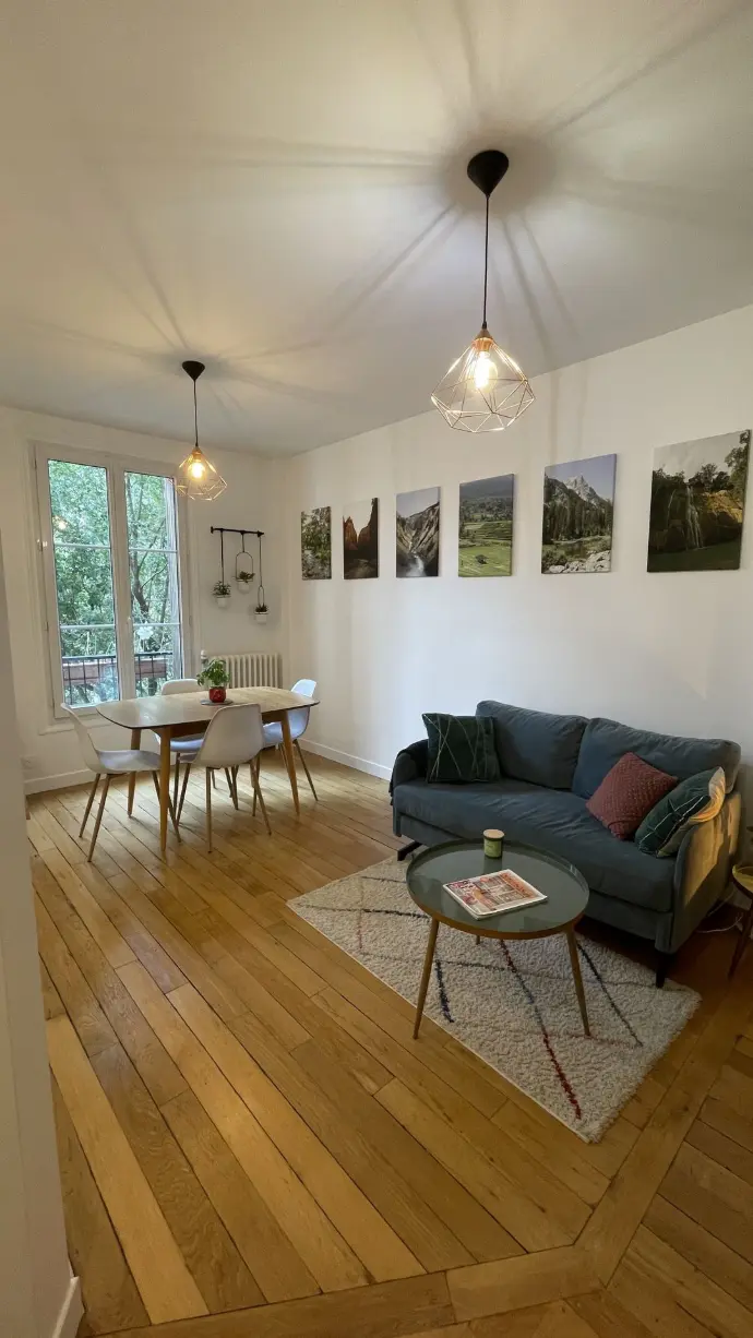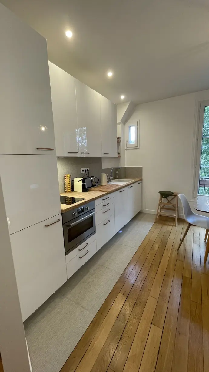 Une nouvelle distribution fluide avec une entrée ouverte sur la pièce de vie dans laquelle la cuisine s’est logée dans l’ancien couloir salle d’eau. Exposé sud, c’est un espace lumineux.