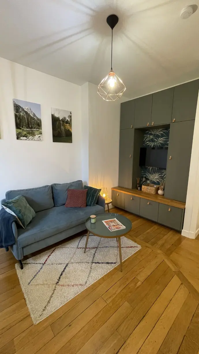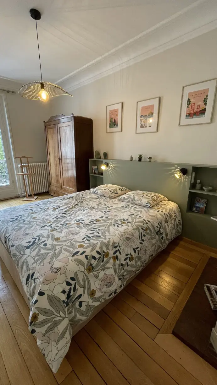 Les rangements Ikea aux façades d'un beau vert profond s'inscrivent dans le fil conducteur déployé dans l'appartement. En effet différentes nuances de vert se retrouvent également dans les chambres.