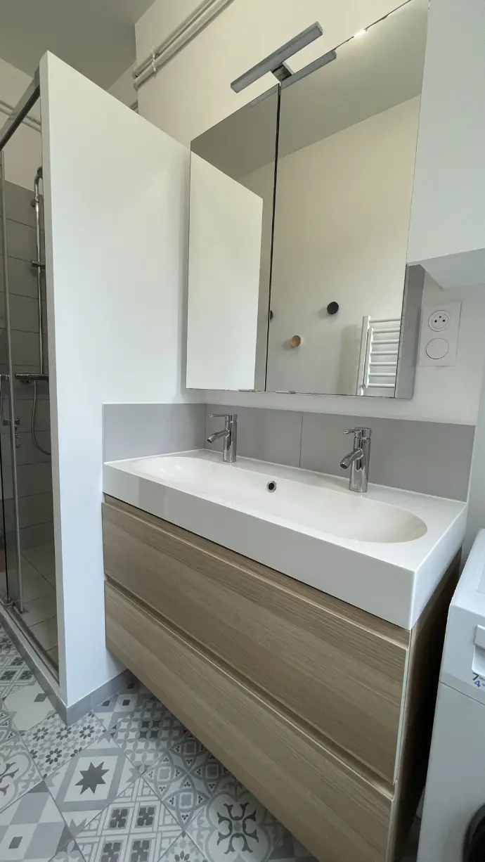 Le plan a été optimisé en ouvrant l'ancien couloir salle d'eau sur la chambre exposée sud et ainsi disposer d'une pièce de vie lumineuse. La salle d'eau s'est alors logée dans l'ancienne cuisine et permet d'accueillir une grande douche et le lave-linge.