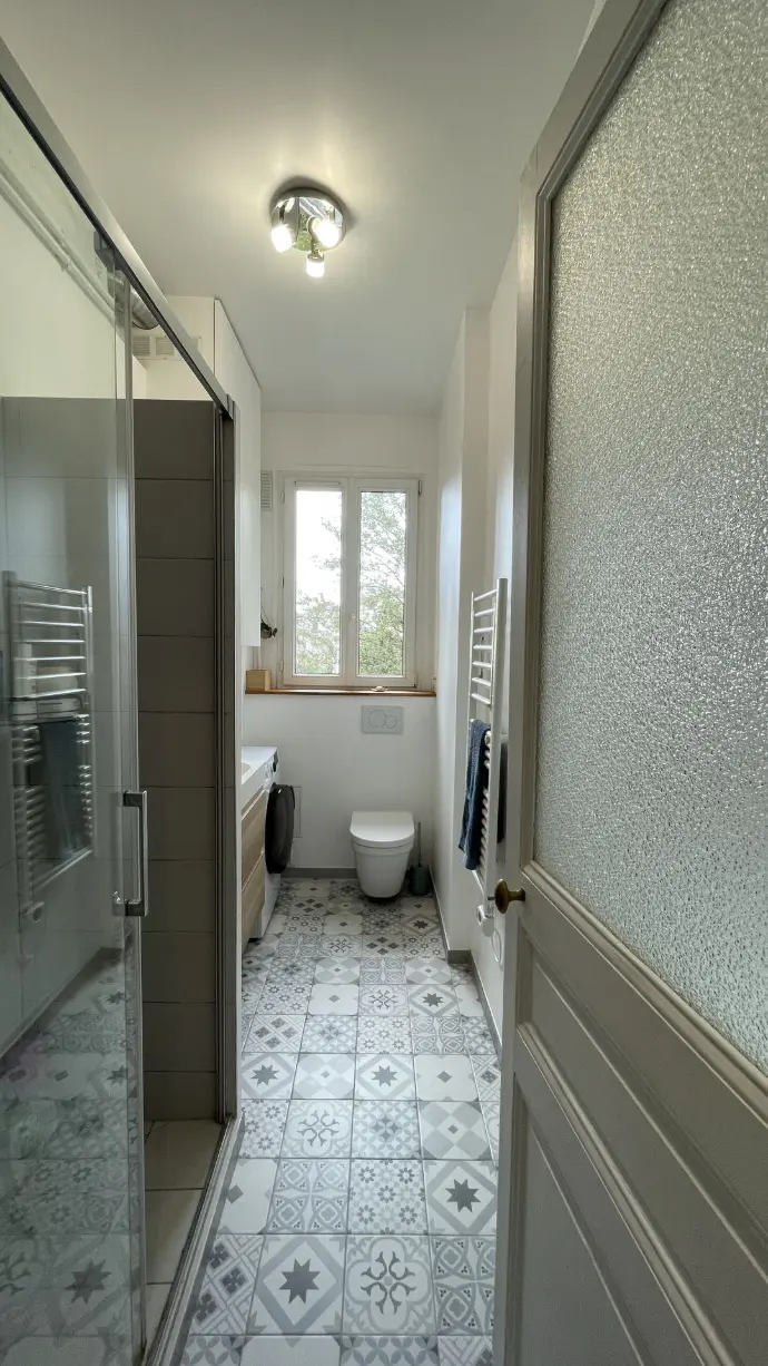 La salle d’eau spacieuse a pris place dans l’ancienne cuisine. Le carrelage effet carreaux de ciment s'inscrit dans l'histoire de l'immeuble.
