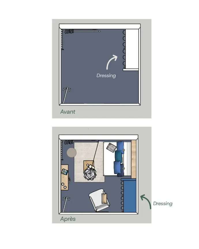 Pour intégrer une banquette BZ dans la pièce, j'ai proposé de basculer le dressing de l'autre côté de la tête de cloison à conserver.