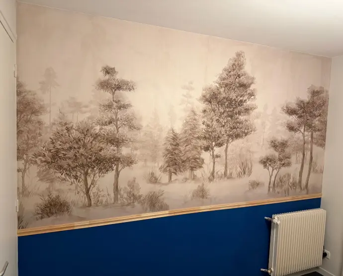Le papier peint panoramique aux tons sepia plonge mes clients au coeur de la forêt.