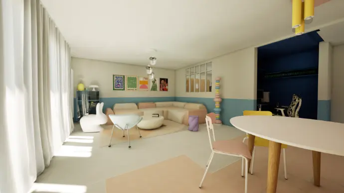 Relooking d'un grand open space de 200m² avec la création d'un espace détente en favorisant la seconde main et l'upcycling.