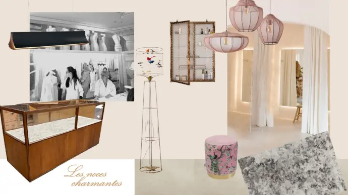 Aménagement et décoration d'un concept store mixant robes de mariée, accessoires et petites décoration